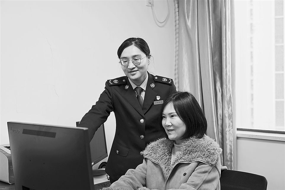 刘禹伶在企业辅导纳税人解决申报问题。