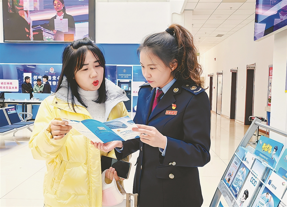 最近,国家税务总局青铜峡市税务局通过多种渠道宣传《中华人民共和国增值税法实施条例》。图为税务干部在办税服务厅为纳税人解答政策问题。