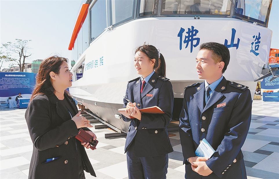 近日,国家税务总局佛山市高明区税务局干部走进西江游艇文化嘉年华活动现场,开展产业调研与税费政策宣讲。图为税务干部向参展企业工作人员了解新能源游艇研发情况。