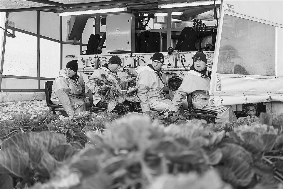 在英国苏格兰W&R洛根农场,工人们正在采摘抱子甘蓝。该农场历经三代人的经营,每年种植面积超过210公顷。
