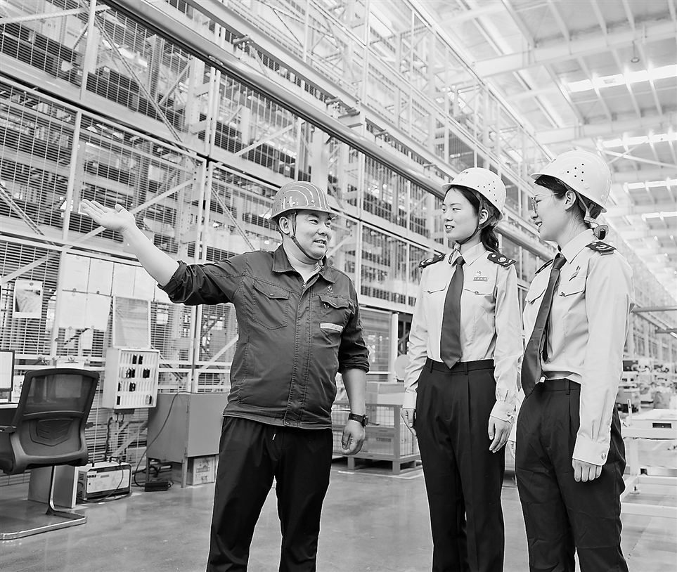 近日,国家税务总局徐州高新技术产业开发区税务局“税先锋”服务队走访纳税信用A级企业,了解企业生产经营情况及涉税费需求。图为车间工人为税务干部介绍企业智能化生产设备运行情况。