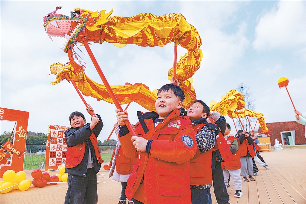 安徽省芜湖市春节期间在鸠兹湾举办户外新春活动,孩子们身着红衣一起舞龙,感受浓郁年味。