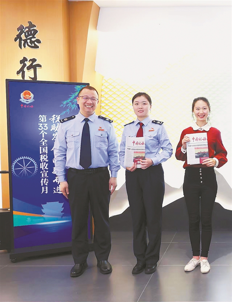何振华(左)在“我与税务报有个约会”阅读分享活动现场与税务干部和纳税人代表合影。