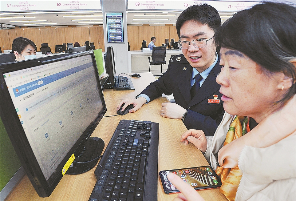 北京有奖发票试点活动启动以来,消费者参与热情高涨,仅春节假期就有近400万人参与摇奖,上传发票超860万张。为确保商户规范开票,国家税务总局北京市西城区税务局制作“数电发票开具全攻略”,通过媒体、网络平台广泛宣传。图为税务干部近日辅导商户为消费者开具数电发票。