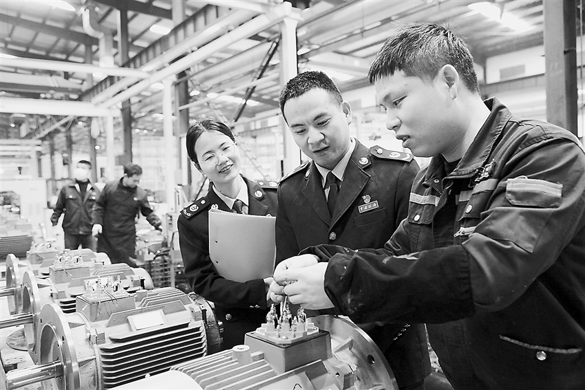 近期,国家税务总局宜春市袁州区税务局走进辖区企业开展针对性税费政策辅导,引导企业合规经营,助推创新发展。图为税务干部日前在一家电机生产企业走访并宣传相关税收政策。