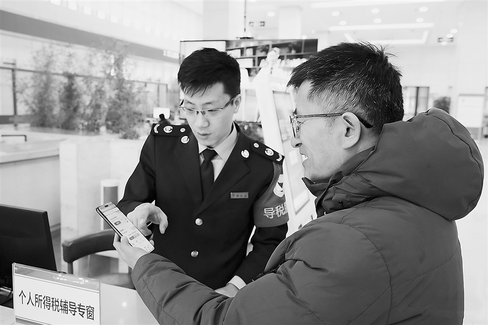 2025年度个人所得税综合所得汇算工作开始后,天津港保税区税务部门在办税服务厅设立咨询专窗,选派青年业务骨干为进厅办理业务的纳税人提供咨询服务。图为税务干部近日为一名纳税人介绍个税App操作方法。