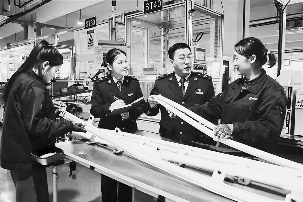 国家税务总局宜兴市税务局近期开展企业走访调研活动,了解企业税费服务需求,现场答疑解惑、引导合规经营。图为税务干部日前在一家汽车安全系统生产服务企业了解生产经营情况,提醒企业防范相关税务风险。