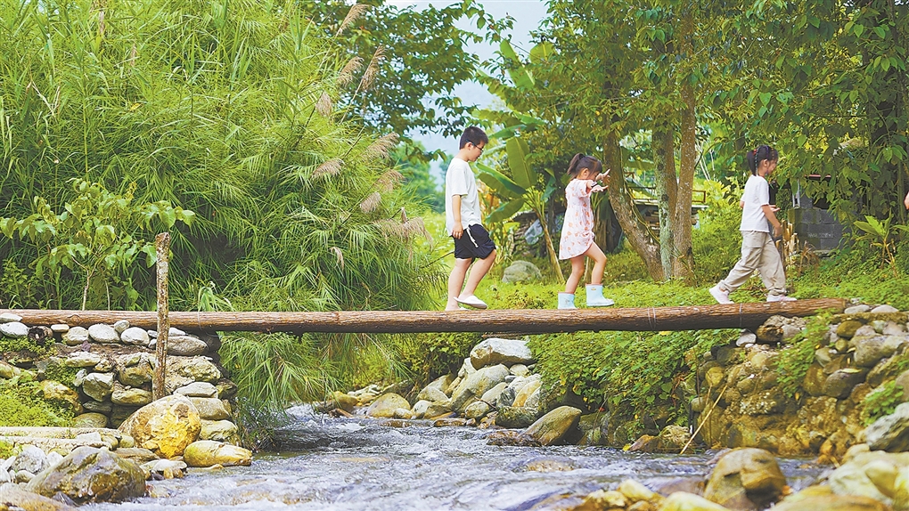 图为孩子们在高黎贡山的林间木桥上嬉戏。