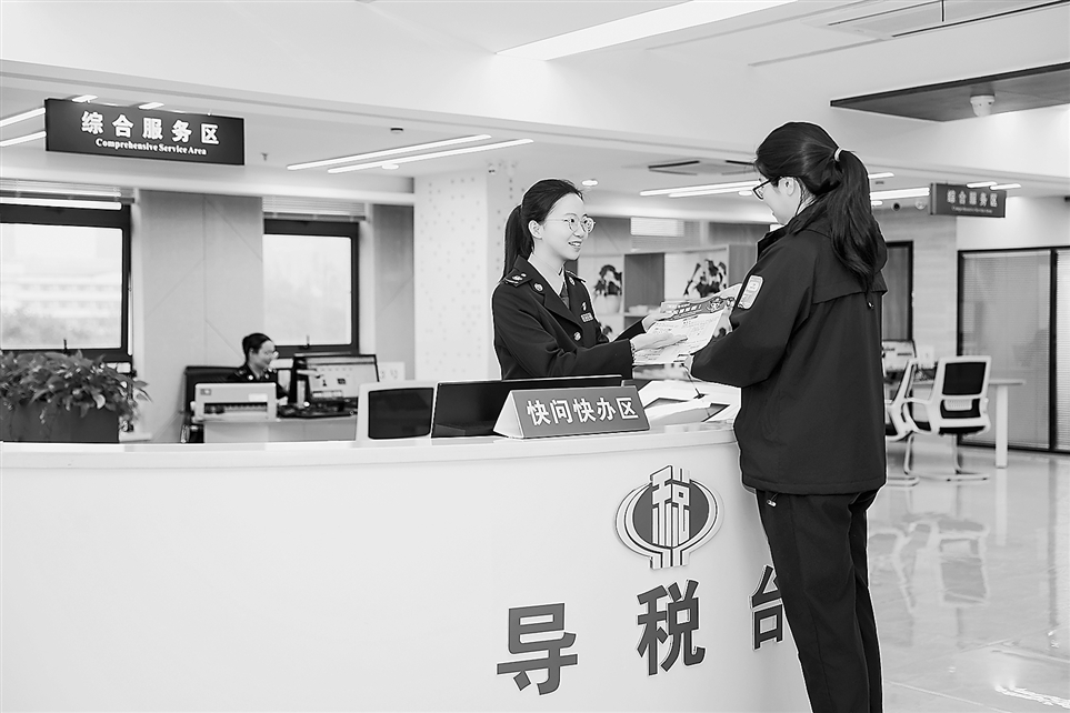 国家税务总局宁波市江北区税务局通过优化流程、整合资源、精准分流,在办税服务厅设置“快问快办区”,破解简易业务办理效率不高问题,提升纳税服务质效。图为税务干部近日在“快问快办区”为纳税人办理简易业务。