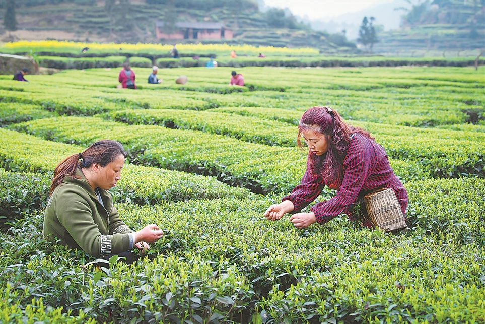 近段时间,四川省荣县21万余亩茶园迎来早春茶采摘黄金季。图为茶农在荣县茶叶核心产区双古镇茶园采摘春茶。