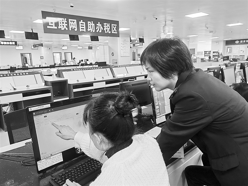 国家税务总局南宁市武鸣区税务局办税服务厅安排业务骨干,为到厅办理汇算申报的纳税人提供咨询服务,帮助高效完成汇算。图为税务干部近日在辅导一名纳税人进行汇算申报。