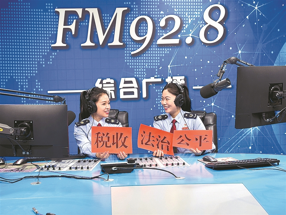 近日,国家税务总局阜新市税务局干部在当地广播电台直播间,向听众解答税费政策疑问。