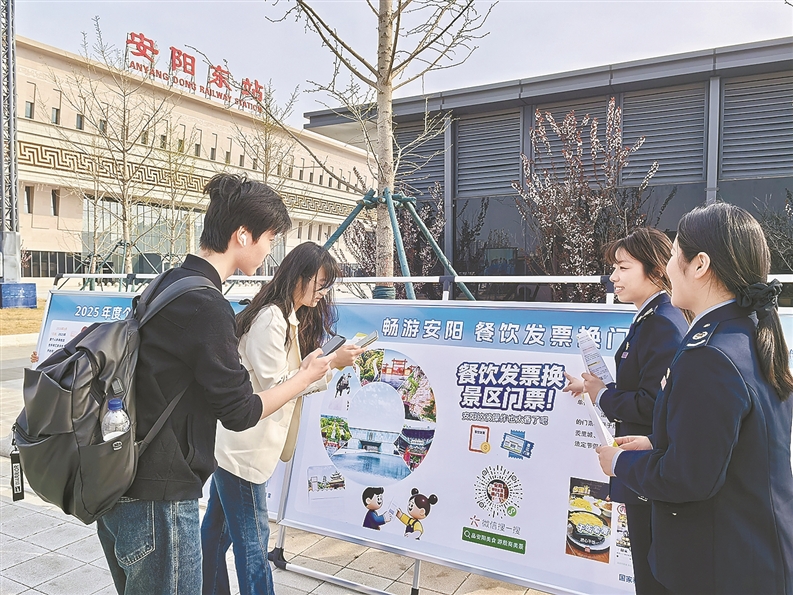 全国税收宣传月期间,国家税务总局安阳市城乡一体化示范区税务局开展“餐饮发票换景区门票”活动,引导消费者积极索要发票。图为税务干部近日在高铁站开展活动宣传,向旅客介绍活动规则,引导旅客扫码参与体验。