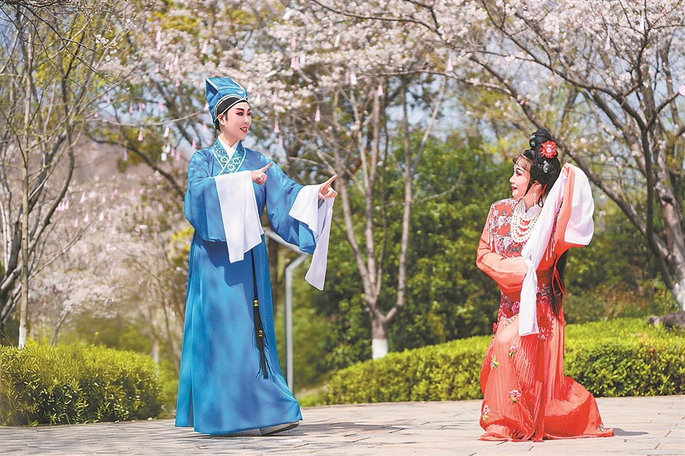 在宁波市宁海县桥头胡街道眠牛山公园,戏曲演员在樱花下表演。