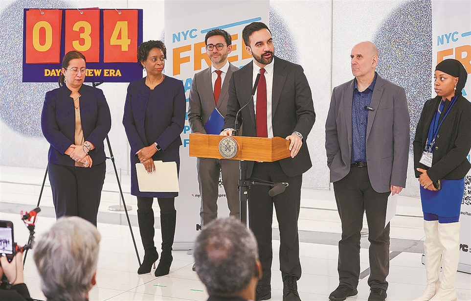 不久前,美国纽约市市长祖赫兰·马姆达尼(右三)在新闻发布会上宣布,为纽约市民提供免费的线下和线上报税服务。图为马姆达尼与政府相关部门代表共同出席2026年报税季免费服务启动仪式。