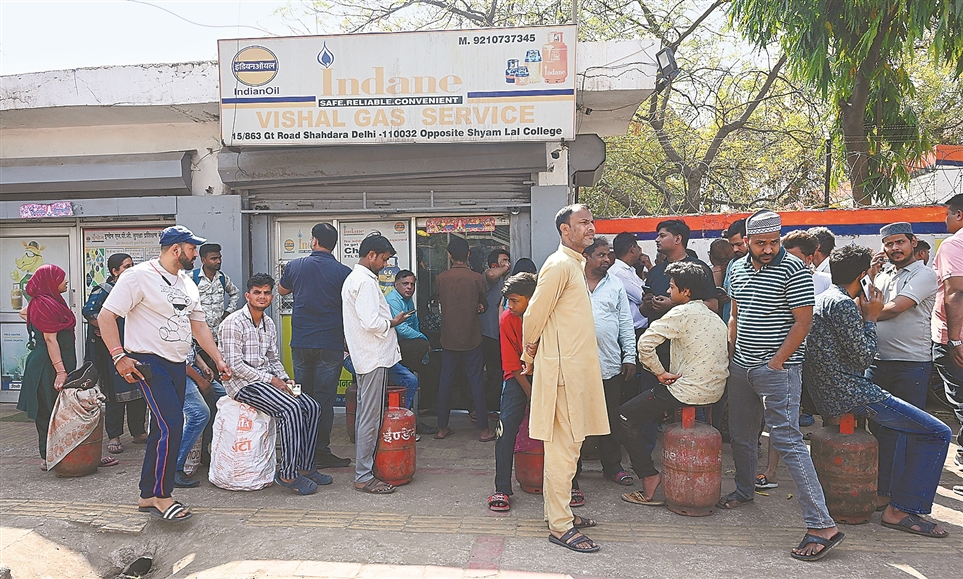 近日,受中东地缘冲突影响,印度液化天然气气瓶供应中断。图为印度新德里民众聚集在一家专营店前等待气瓶充装。