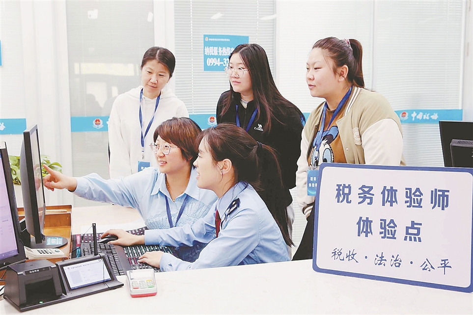 全国税收宣传月期间,各地税务部门采取“请进来”“走出去”等方式,邀请纳税人代表到办税服务厅担任税费服务体验师,为税费服务“问诊把脉”;派出业务骨干走进商业街区向纳税人问需解难,将税费服务送到他们身边。左图为国家税务总局阜康市税务局组织税务体验师在办税服务厅体验自助办税。右图为国家税务总局青岛市市北区税务局干部在一家手机专卖店解答纳税人的疑难问题。 罗涛 冯国滨 万云军 摄