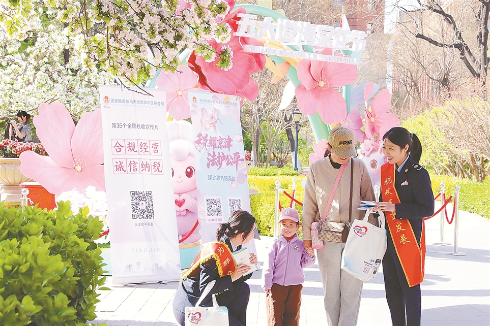 春风轻拂海棠,“税”月相伴花香。第四届五大道海棠花节期间,国家税务总局天津市和平区税务局干部走进盛开的海棠花海,向赏花游客宣传个人所得税相关知识。