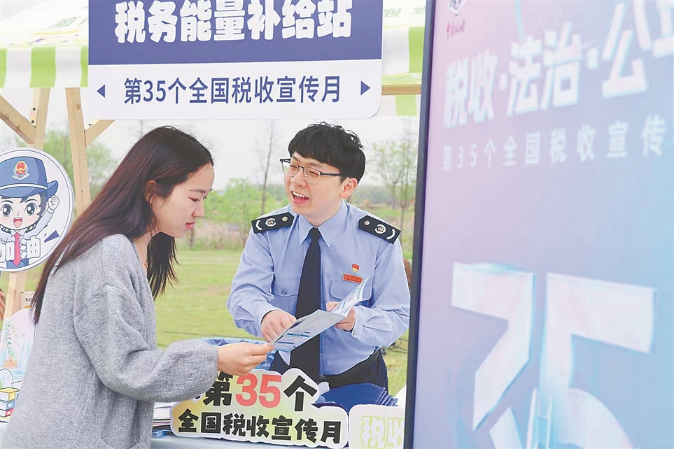 近日,国家税务总局宁波前湾新区税务局组织干部走进杭州湾国家湿地公园,开展税法进文旅打卡地活动。图为在“税务能量补给站”前,税务干部为来往游客解答涉税问题。