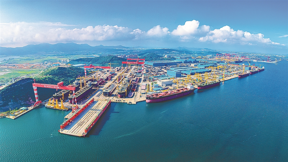 前不久,恒力重工集团有限公司3号船坞内,6艘8.2万载重吨散货船同步出坞。该吨级散货船实现同坞建造、同日出坞,创下全球造船行业全新纪录。 恒力重工2022年落户大连长兴岛经济技术开发区,作为恒力集团全资子公司正式进军船舶制造领域。成立4年多来,企业发展势头强劲,持续推动制造业向高端化、数字化、智能化转型,实现绿色低碳化建造、批量化高效交船,大幅提速船舶建造与项目建设进度,目前造船订单已排至2030年。 国家税务总局大连市税务局聚焦优化税收营商环境,创新推出多项服务举措,针对重点税源企业实行“一企一策”个性化税费服务。去年以来,该局安排专人专岗全程跟进政策咨询、资料预审、正式受理等全流程,以优质、精细的税费服务助力恒力集团稳健发展。 图为大连长兴岛恒力重工生产码头全景。