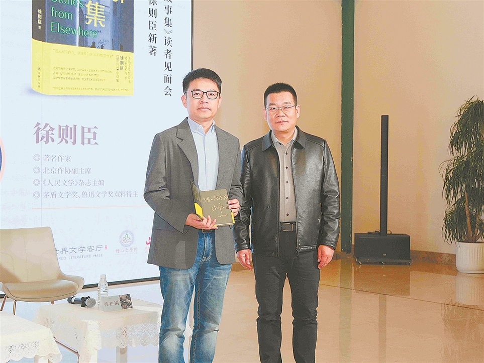 茅盾文学奖、鲁迅文学奖得主徐则臣(右)向世界文学客厅赠书。