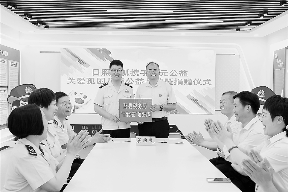 卢刚(后排左)代表“十元公益 青税助学”志愿服务项目,向日照市灯塔孤困儿童志愿服务中心捐赠公益善款。