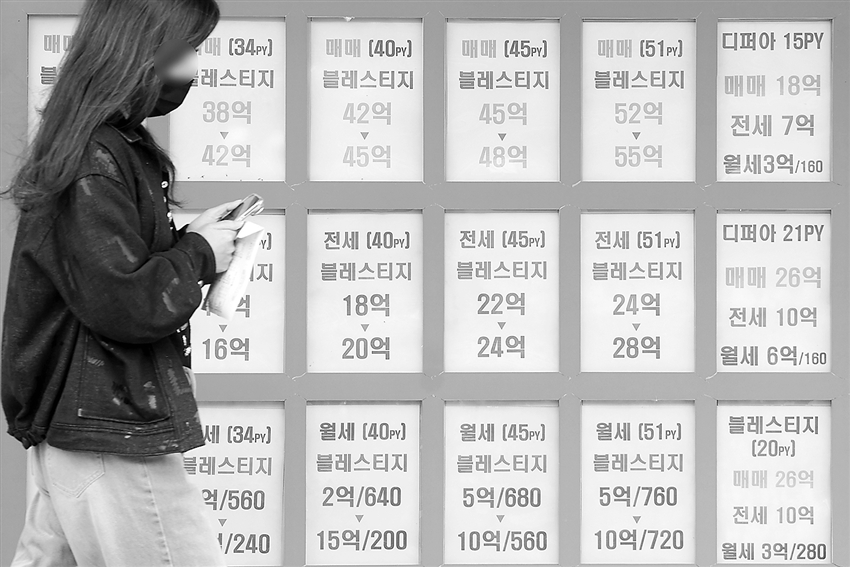 韩国将于今年下半年起对滥用商业贷款购房逃税的行为进行全面审查。图为韩国首尔江南区某不动产中介所张贴的房源信息。