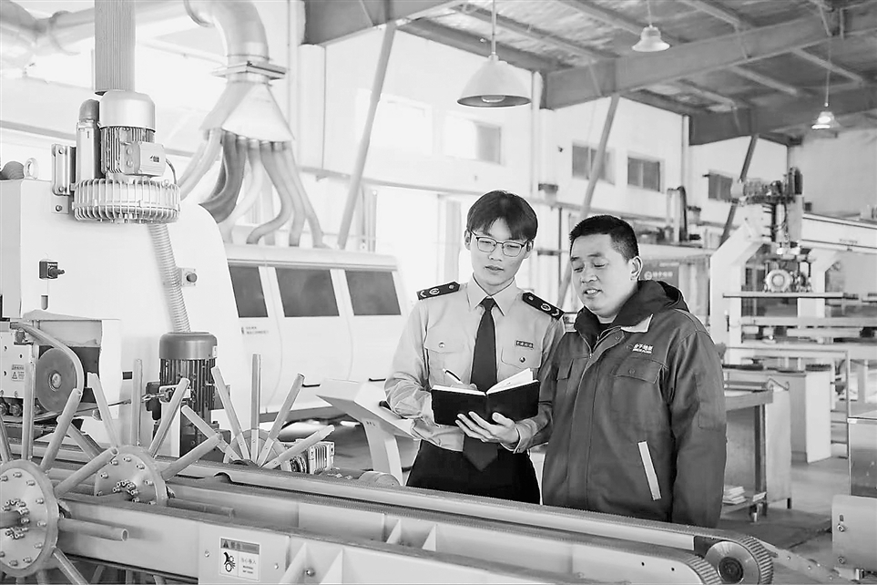 全国税收宣传月期间,国家税务总局来安县税务局组织青年干部走访企业问需解难,进一步提升纳税人合规经营、依法纳税的主动性。图为该局税务干部在一家制造业企业了解其生产情况,并进行税费政策宣传辅导。