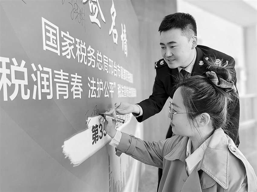 全国税收宣传月期间,国家税务总局邢台市襄都区税务局干部走进邢台学院开展“税润青春 法护公平”税收宣传活动。图为活动中税务干部引导师生在依法诚信纳税签名墙上签名。
