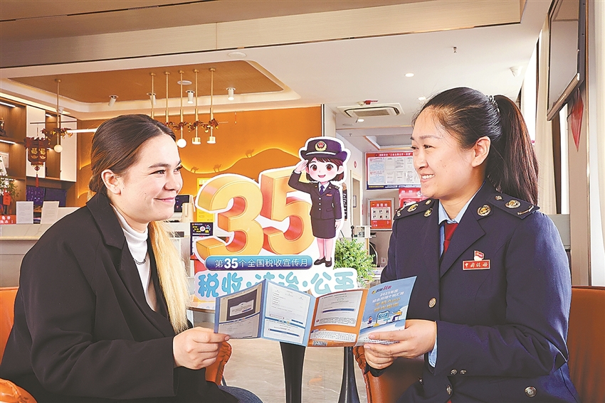 最近,国家税务总局鄯善县税务局组织开展“税法进商圈”活动。图为税务干部在当地热门商圈为企业人员讲解税费政策。