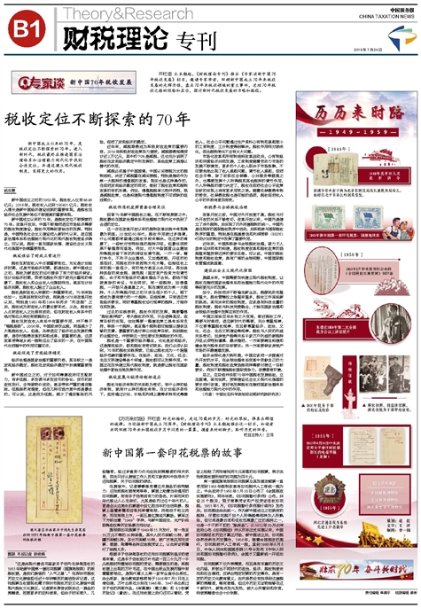 从本期起,《财税理论专刊》推出《专家谈新中国70年税收发展》栏目,邀请专家学者,回顾新中国成立70年来税收发展的光辉历程,盘点70年来税收领域的重大事件,总结70年税收之路的经验和启示,探讨新时代税收发展的方略和路径。 <