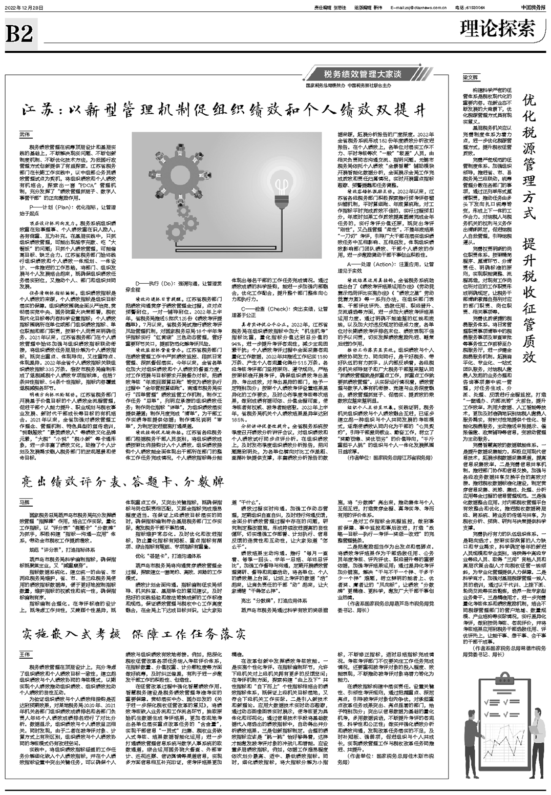 税务绩效管理在统筹顶层设计和基层实践的基础上,不断解决现实问题、不断创新制度机制、不断优化技术方法,为我国行政管理方式创新提供了有益探索。江苏省税务部门在长期工作实践中,以中组部公务员绩效管理试点为契机,将组织绩效和个人绩