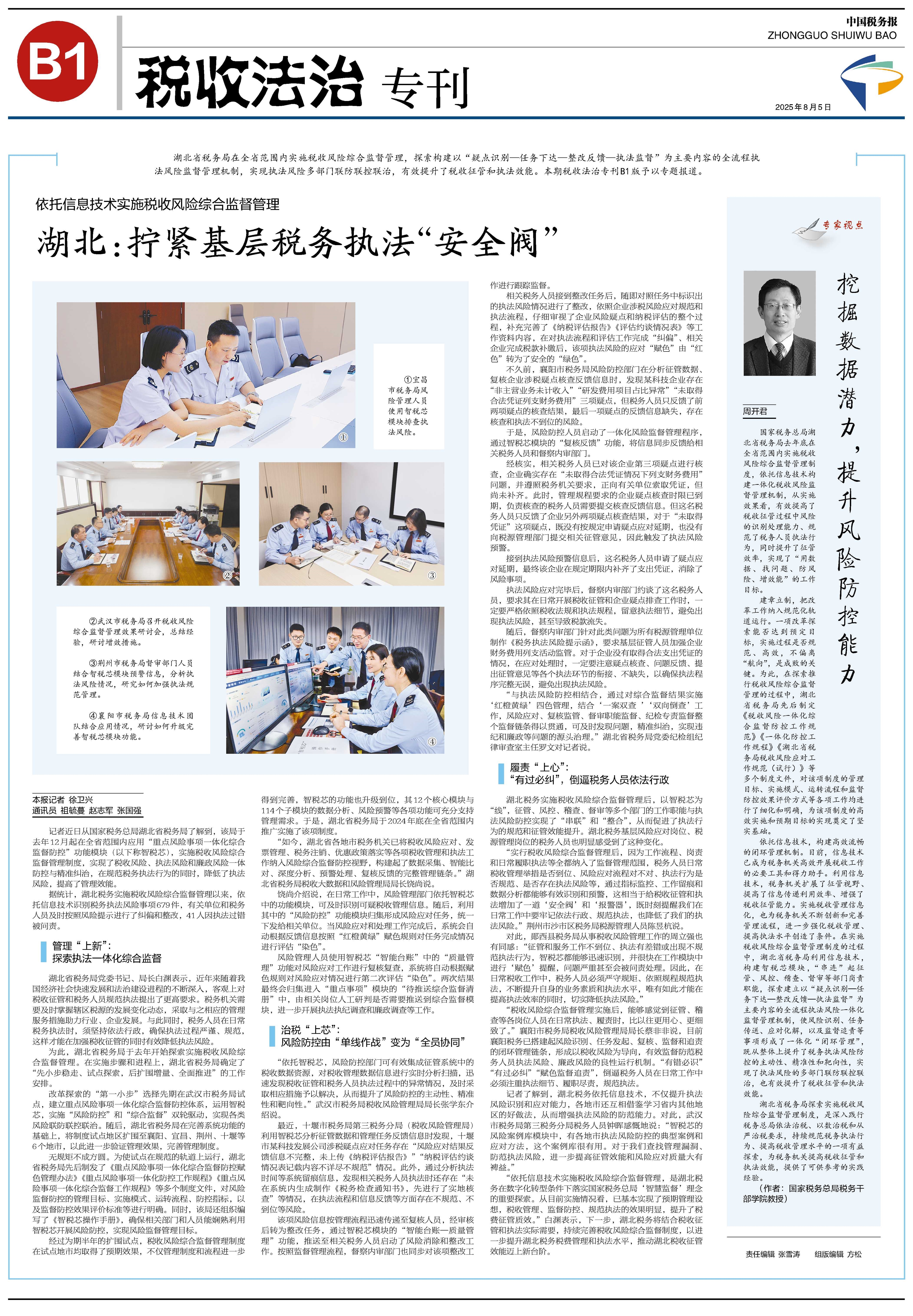 湖北省税务局在全省范围内实施税收风险综合监督管理,探索构建以“疑点识别—任务下达—整改反馈—执法监督”为主要内容的全流程执法风险监督管理机制,实现执法风险多部门联防联控联治,有效提升了税收征管和执法效能。本期税收法治专刊B