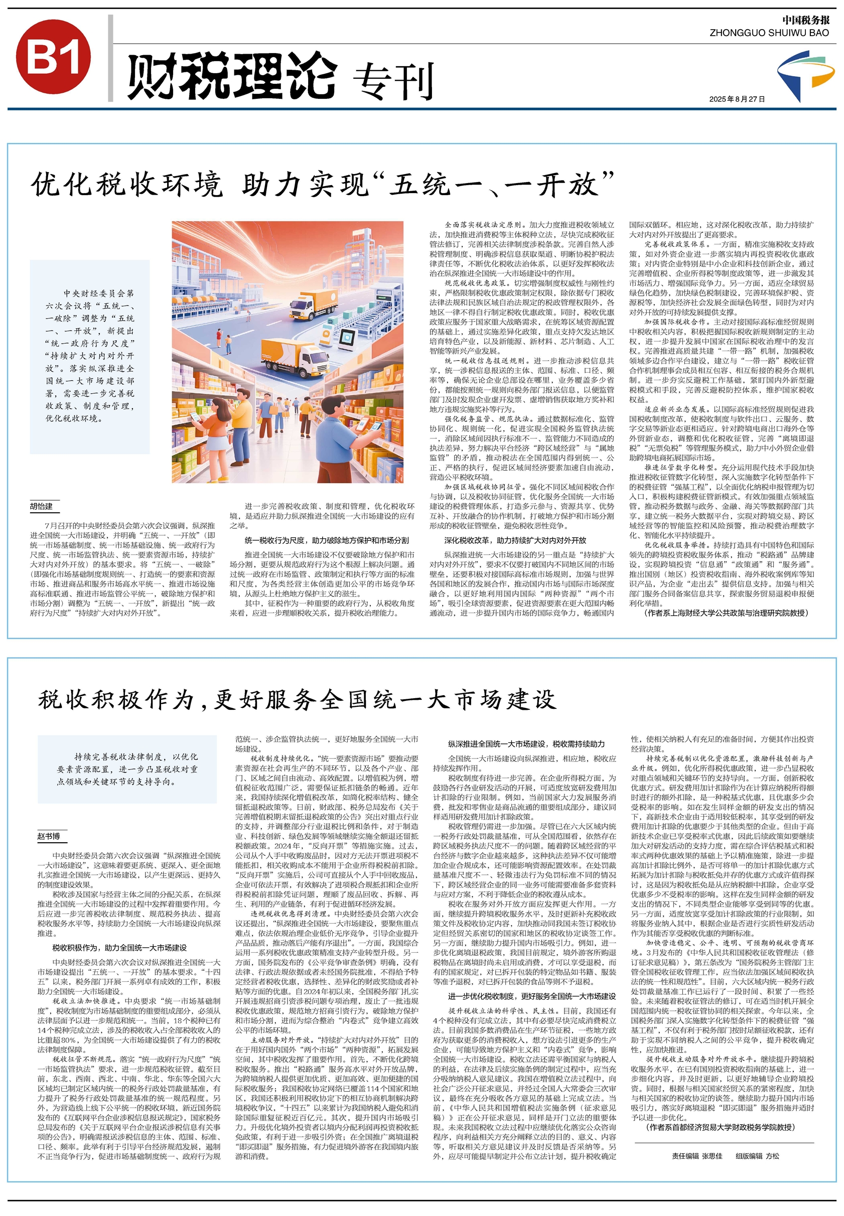 中央财经委员会第六次会议将“五统一、一破除”调整为“五统一、一开放”,新提出“统一政府行为尺度”“持续扩大对内对外开放”。落实纵深推进全国统一大市场建设部署,需要进一步完善税收政策、制度和管理,优化税收环境。