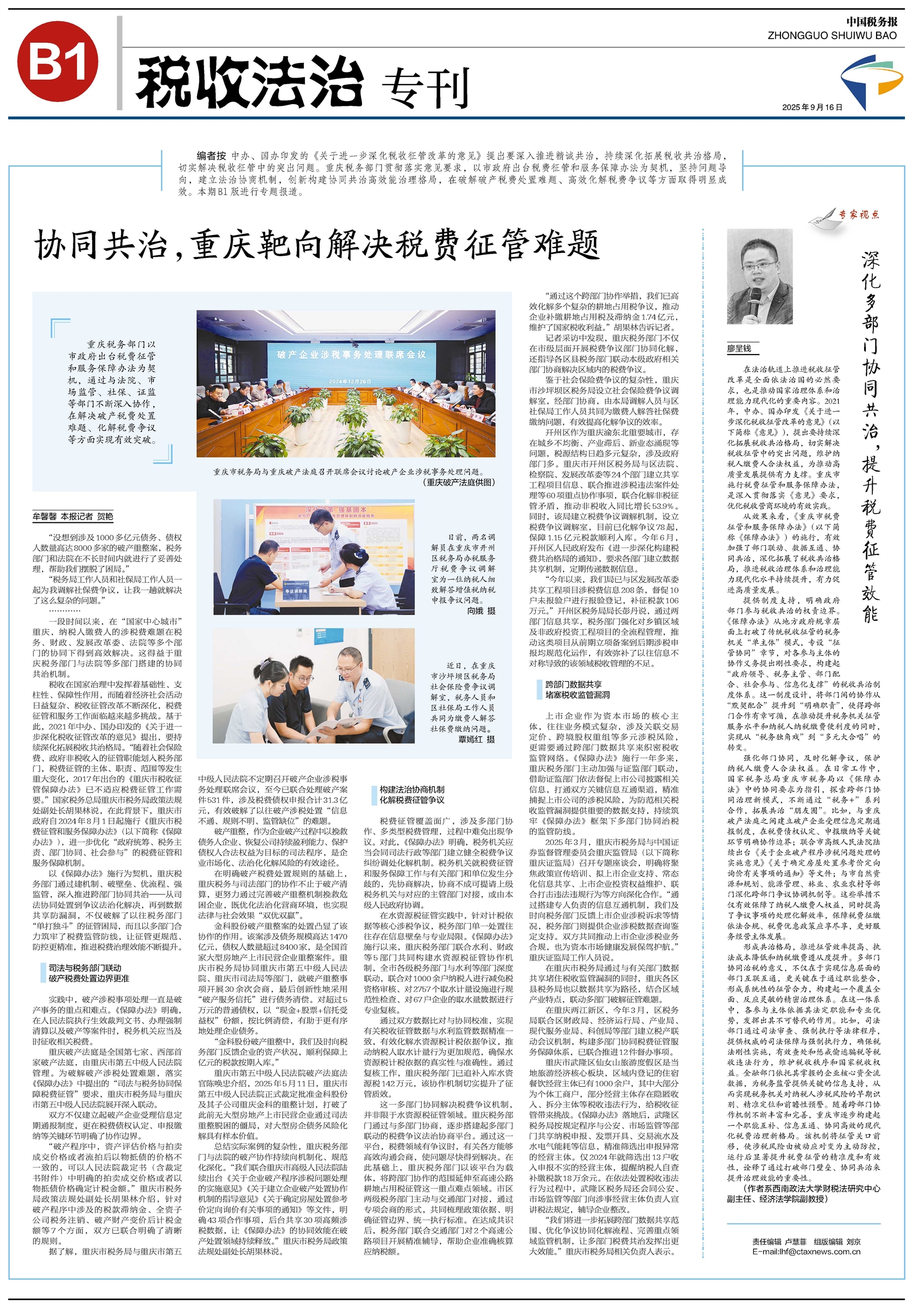 重庆税务部门以市政府出台税费征管和服务保障办法为契机,通过与法院、市场监管、社保、证监等部门不断深入协作,在解决破产税费处置难题、化解税费争议等方面实现有效突破。