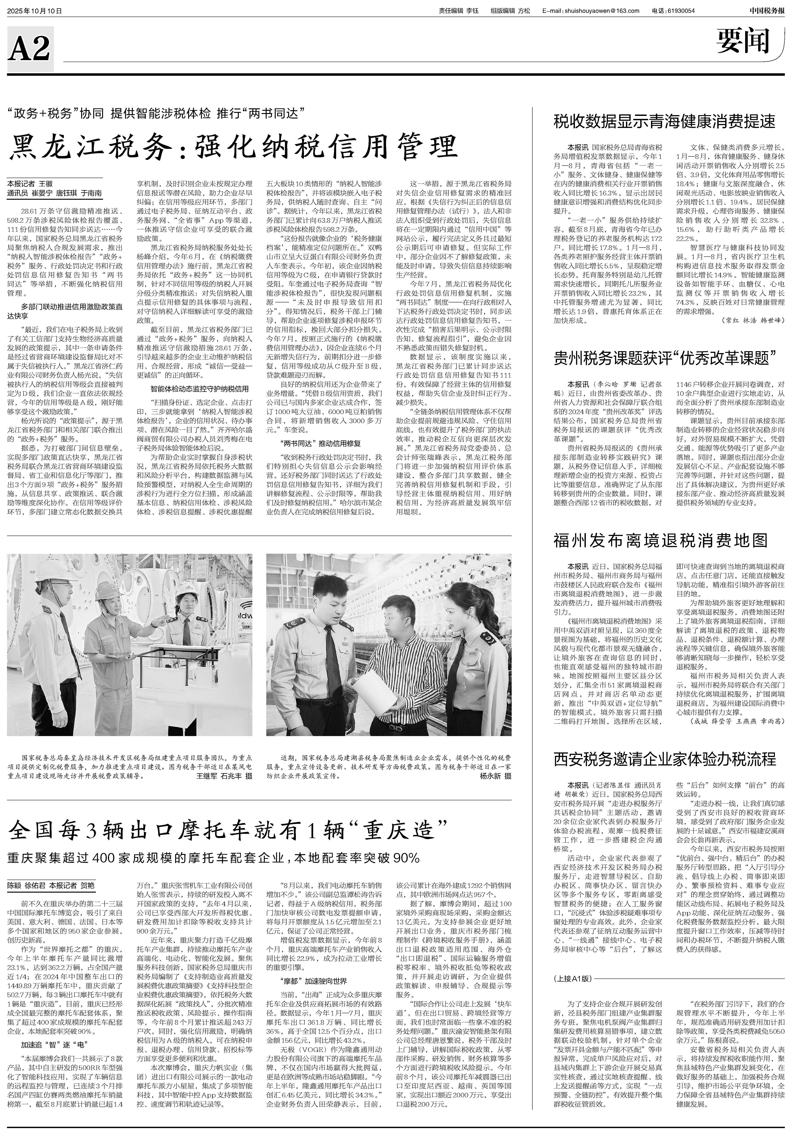 28.61万条守信激励精准推送、598.2万条涉税风险体检报告覆盖、111份信用修复告知同步送达……今年以来,国家税务总局黑龙江省税务局聚焦纳税人合规发展需求,推出“纳税人智能涉税体检报告”“政务+税务”服务、行政处罚决定