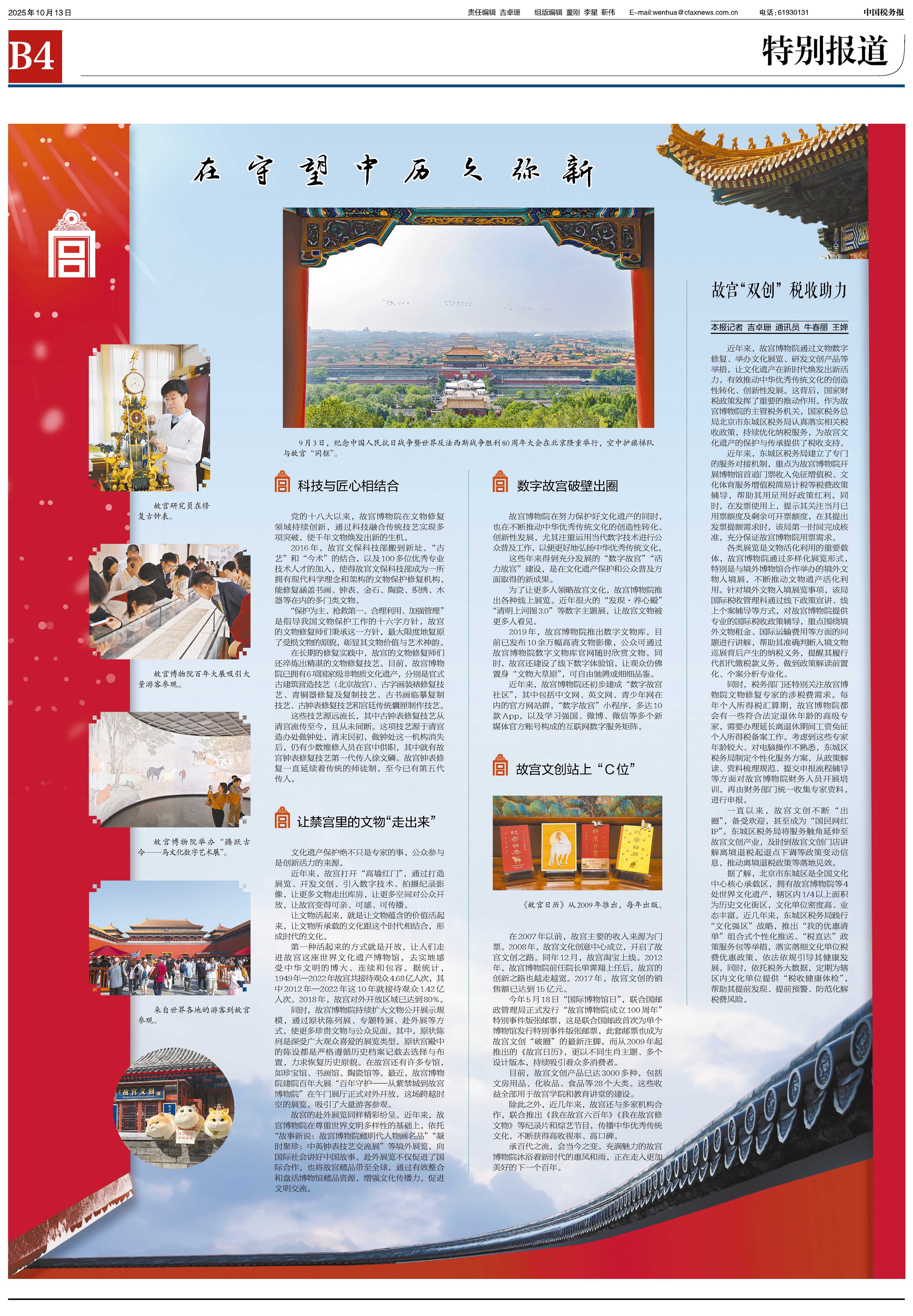 近年来,故宫打开“高墙红门”,通过打造展览、开发文创、引入数字技术、拍摄纪录影像,让更多文物走出库房,让更多空间对公众开放,让故宫变得可亲、可感