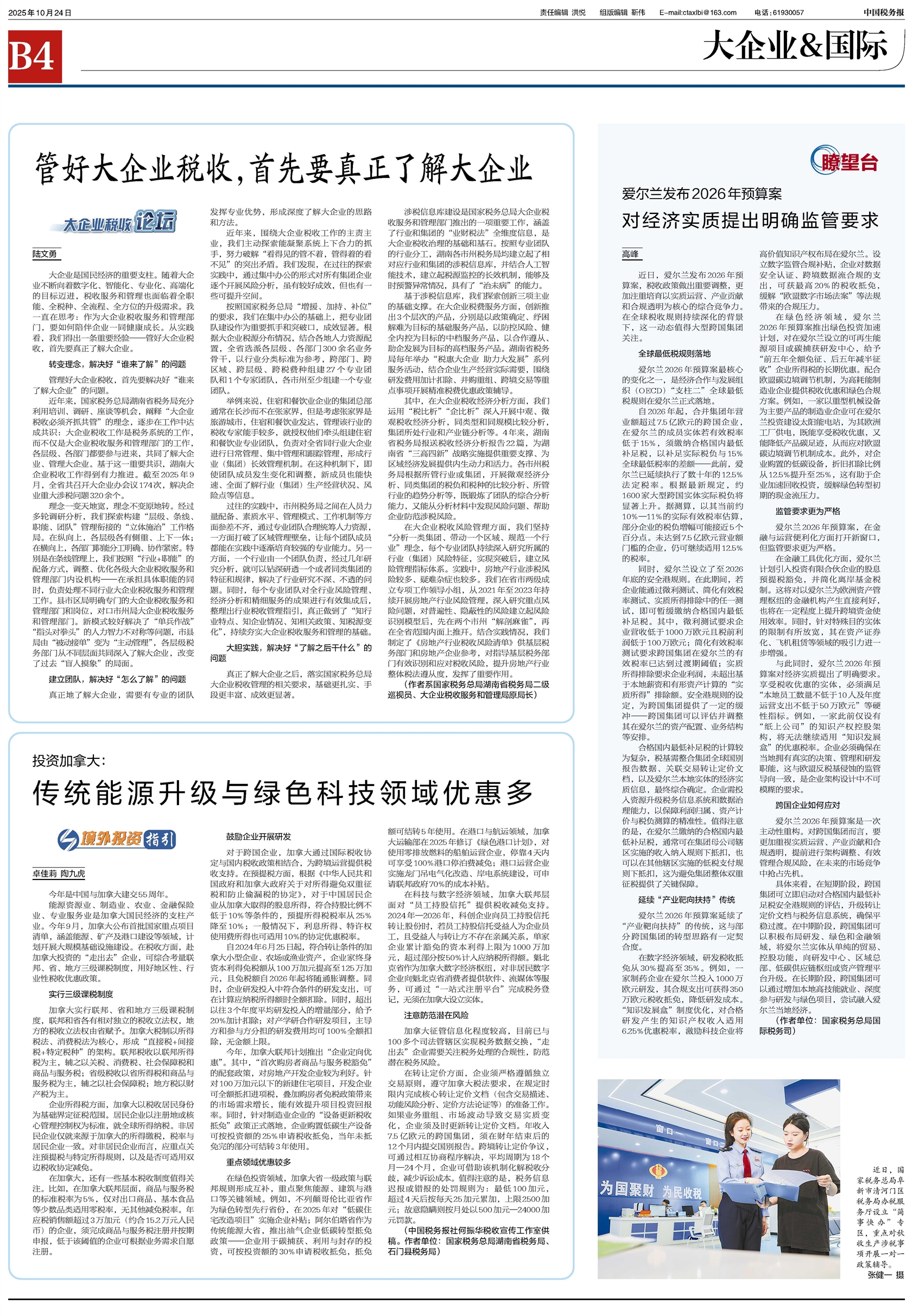 大企业是国民经济的重要支柱。随着大企业不断向着数字化、智能化、专业化、高端化的目标迈进,税收服务和管理也面临着全职能、全税种、全流程、全方位的升级需求。我一直在思考:作为大企业税收服务和管理部门,要如何陪伴企业一同健康成长