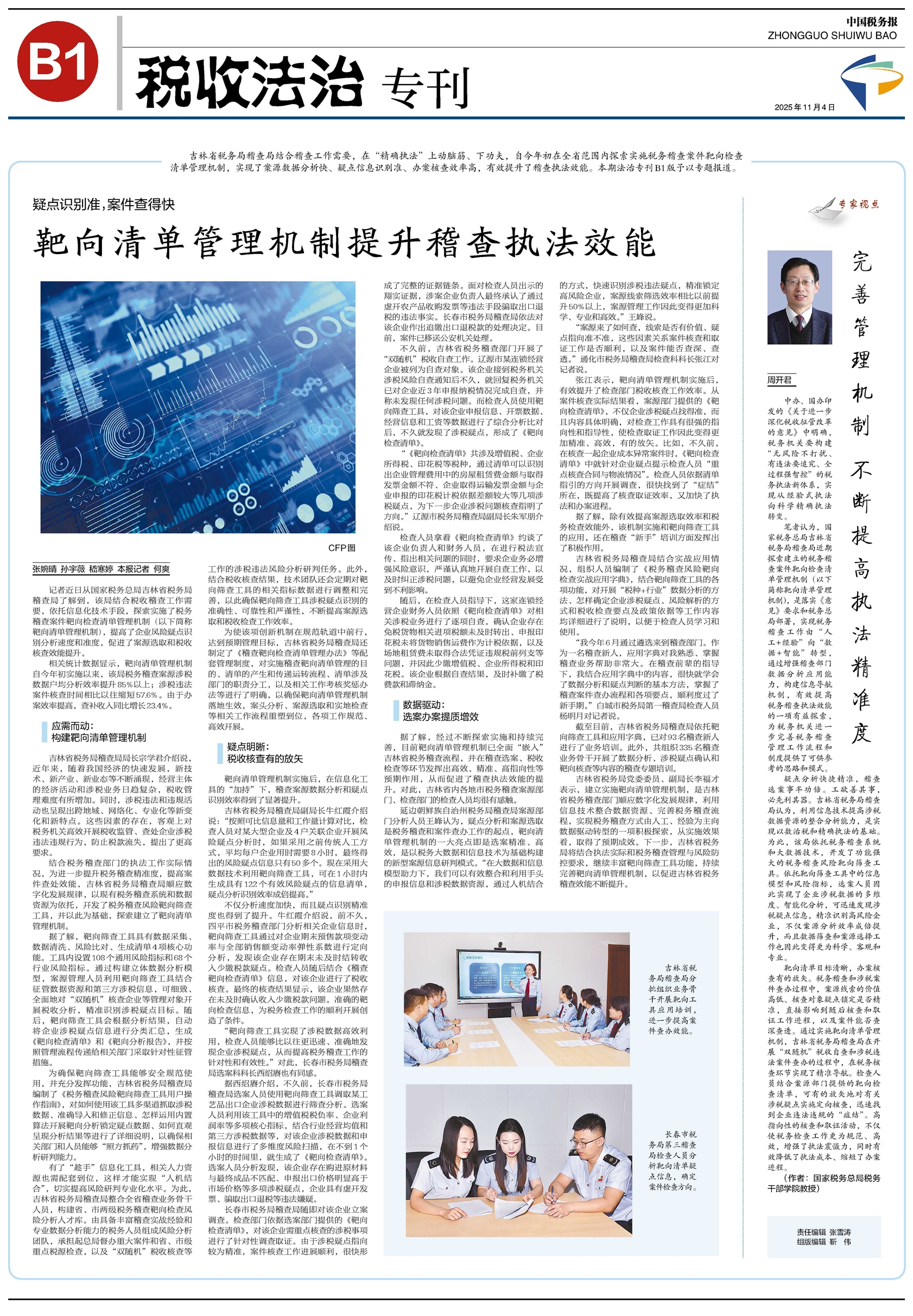 吉林省税务局稽查局结合稽查工作需要,在“精确执法”上动脑筋、下功夫,自今年初在全省范围内探索实施税务稽查案件靶向检查清单管理机制,实现了案源数据分析快、疑点信息识别准、办案核查效率高,有效提升了稽查执法效能。本期法治专刊B