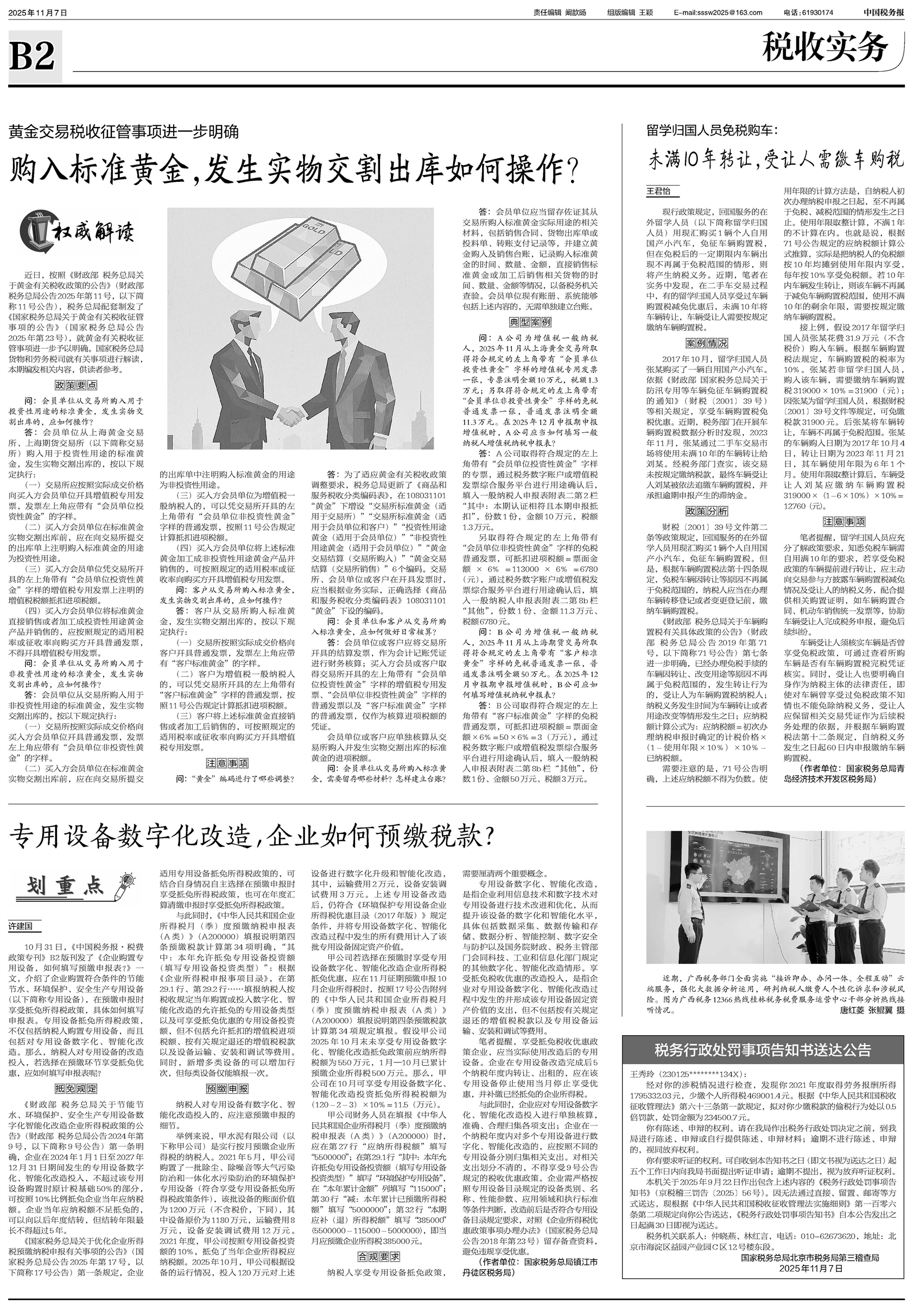 近日,按照《财政部 税务总局关于黄金有关税收政策的公告》(财政部 税务总局公告2025年第11号,以下简称11号公告),税务总局配套制发了《国家税务总局关于黄金有关税收征管事项的公告》(国家税务总局公告2025年第23号)