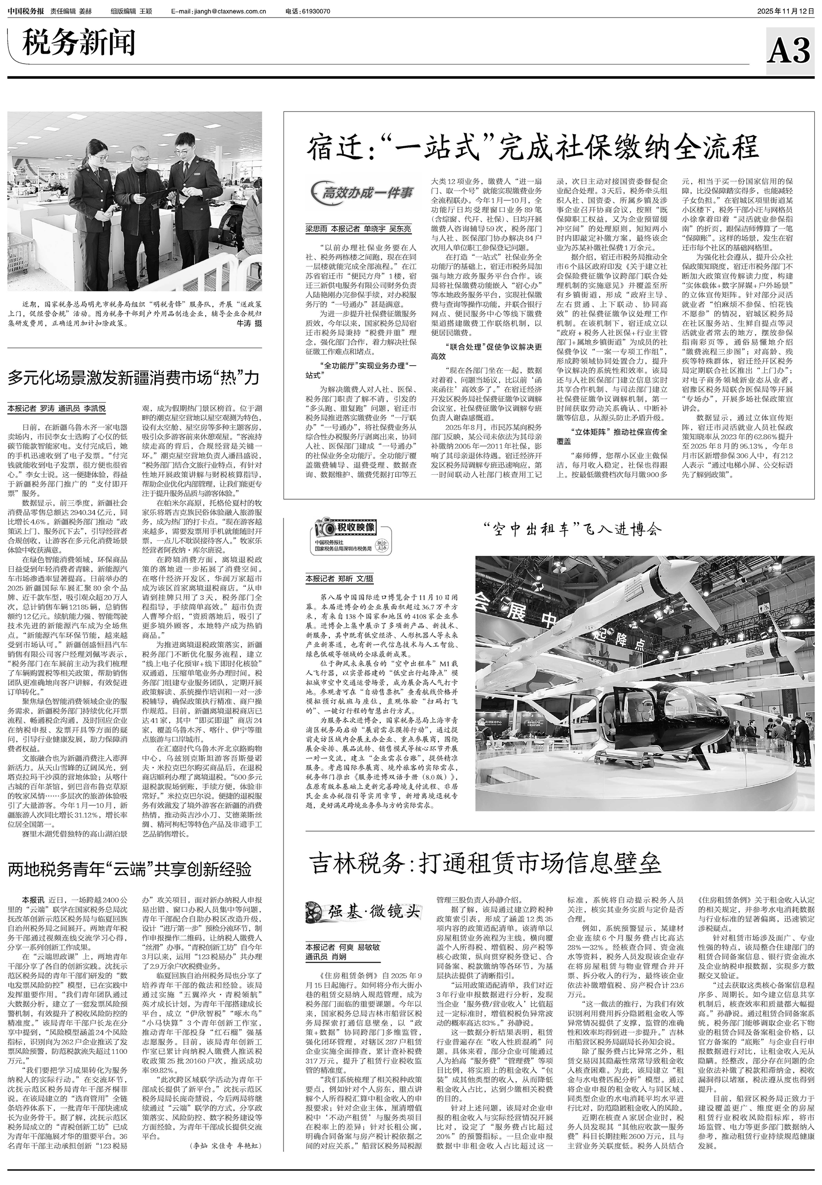 “以前办理社保业务要在人社、税务两栋楼之间跑,现在在同一层楼就能完成全部流程。”在江苏省宿迁市“便民方舟”1楼,宿迁三新供电服务有限公司财务负责人陆艳刚办完参保手续,对办税服务厅的“一号通办”甚是满意。