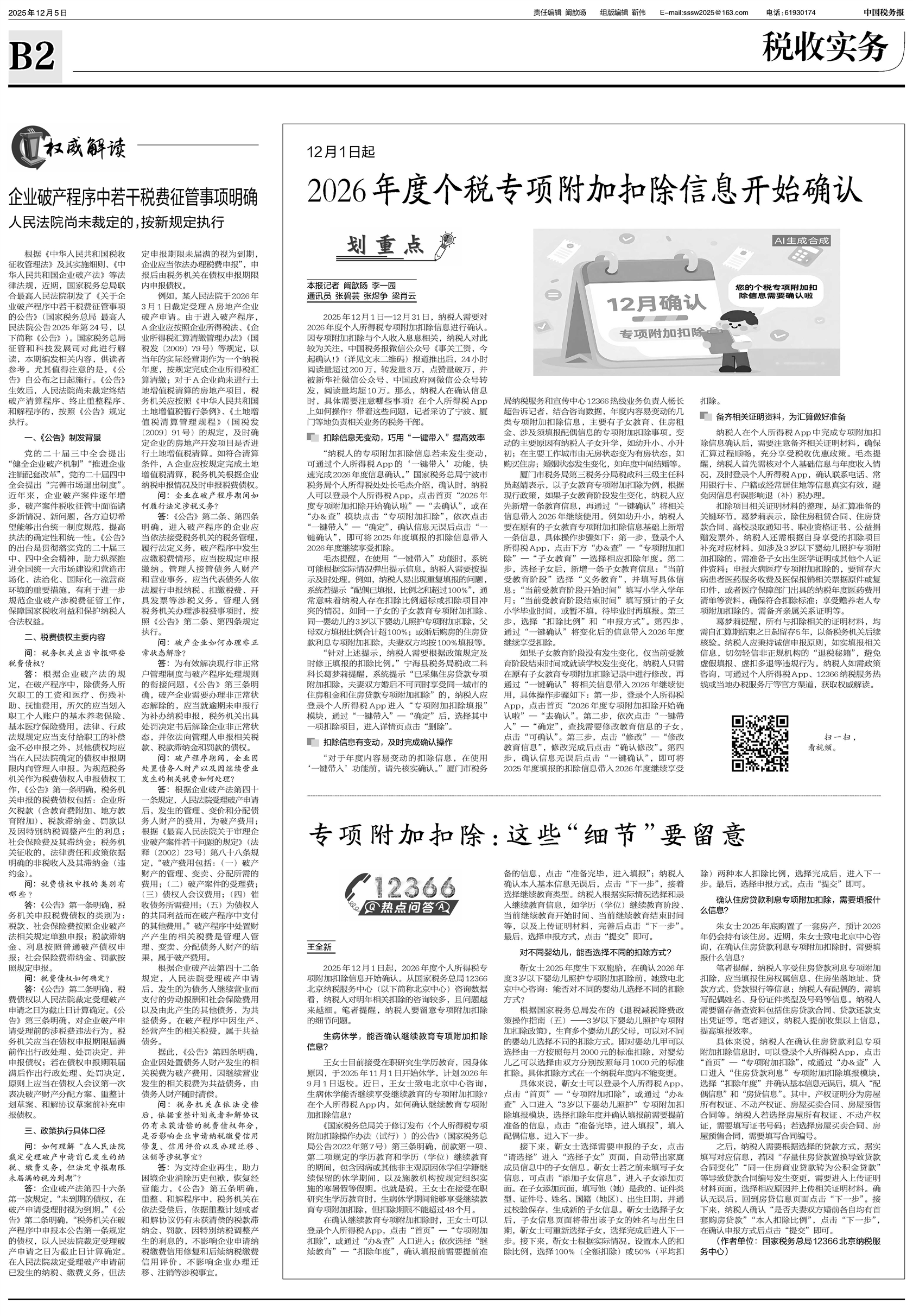 2025年12月1日—12月31日,纳税人需要对2026年度个人所得税专项附加扣除信息进行确认。因专项附加扣除与个人收入息息相关,纳税人对此较为关注,中国税务报微信公众号《事关工资,今起确认!》(详见文末二维码)报道推出后