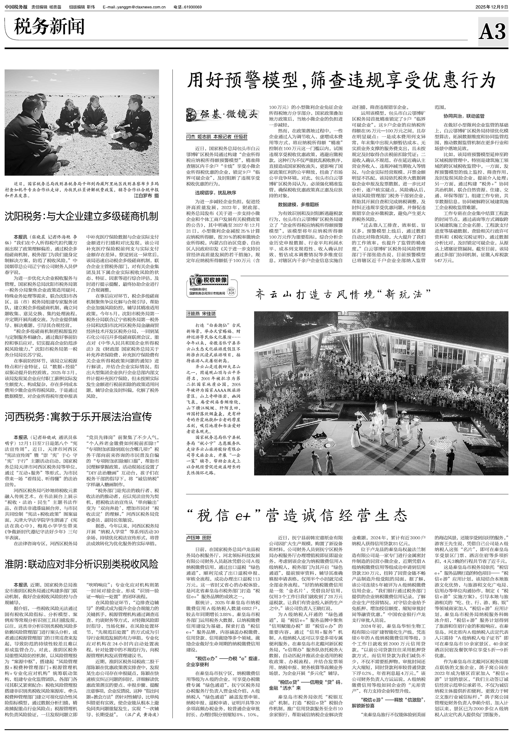 本报讯 “我们在个人所得税代扣代缴方面出现了政策理解偏差,通过税企多级磋商机制,税务部门为我们量身定制解决方案,防范了税收风险。”中国烟草总公司辽宁省公司财务人员伊春宇说。