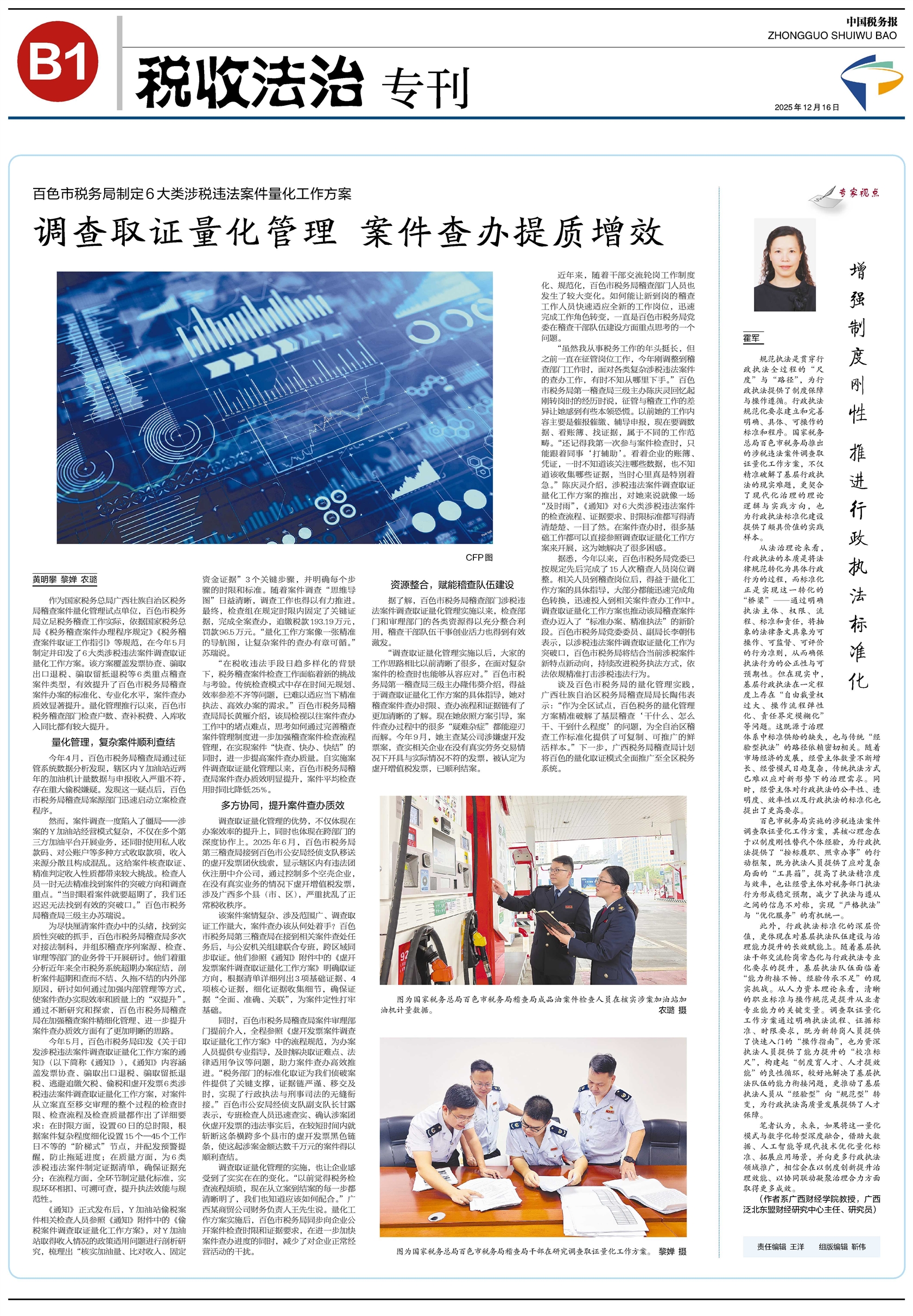 规范执法是贯穿行政执法全过程的“尺度”与“路径”,为行政执法提供了制度保障与操作遵循。行政执法规范化要求建立和完善明确、具体、可操作的标准和程序。国家税务总局百色市税务局推出的涉税违法案件调查取证量化工作方案,不仅精准破解