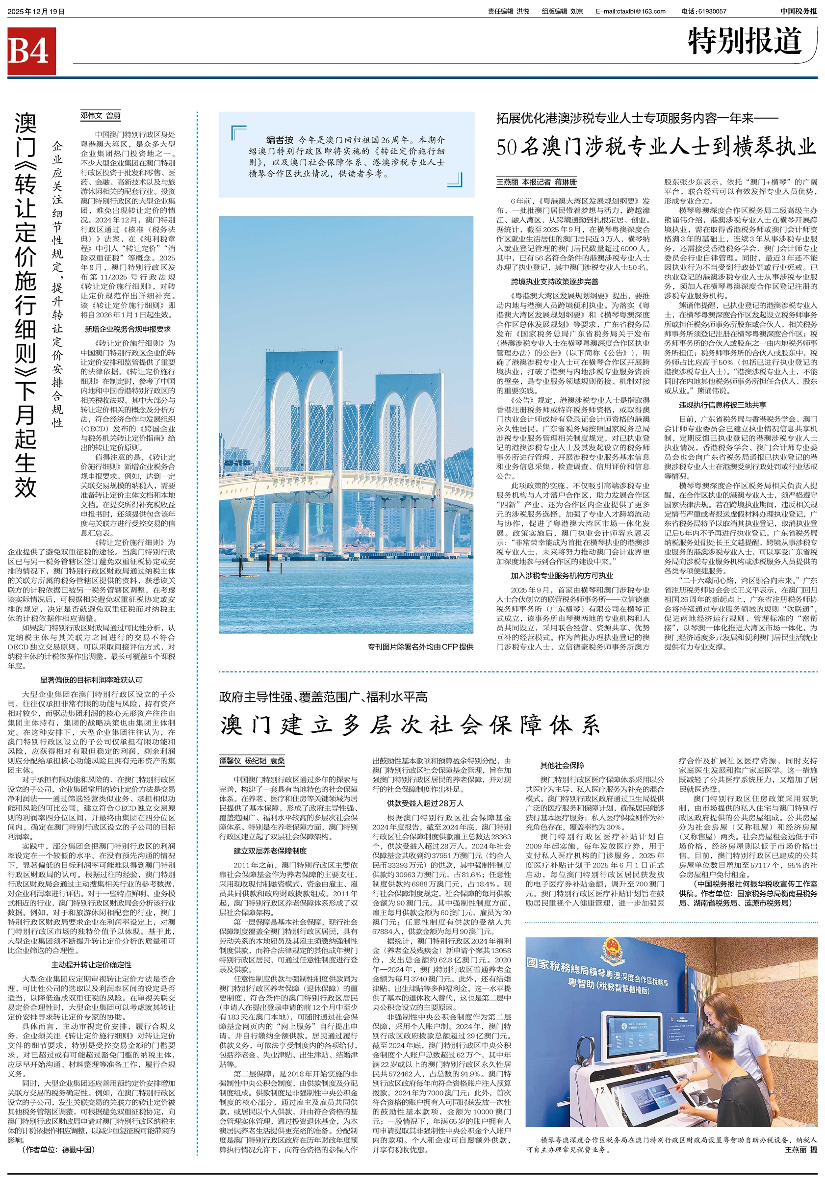 今年是澳门回归祖国26周年。本期介绍澳门特别行政区即将实施的《转让定价施行细则》,以及澳门社会保障体系、港澳涉税专业人士横琴合作区执业情况,供读者参考。