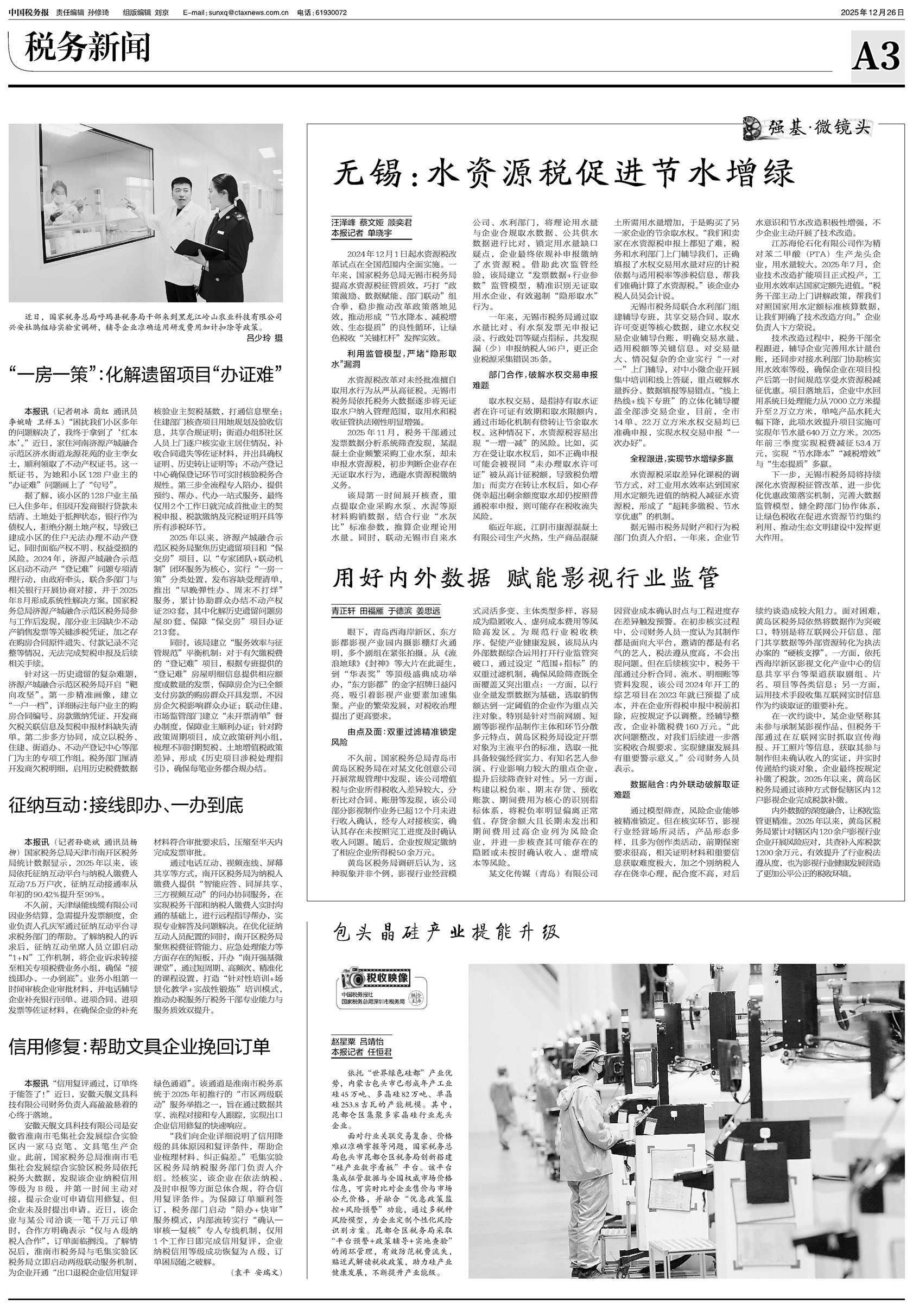 2024年12月1日起水资源税改革试点在全国范围内全面实施。一年来,国家税务总局无锡市税务局提高水资源税征管质效,巧打“政策激励、数据赋能、部门联动”组合拳,稳步推动改革政策落地见效,推动形成“节水降本、减税增效、生态提质
