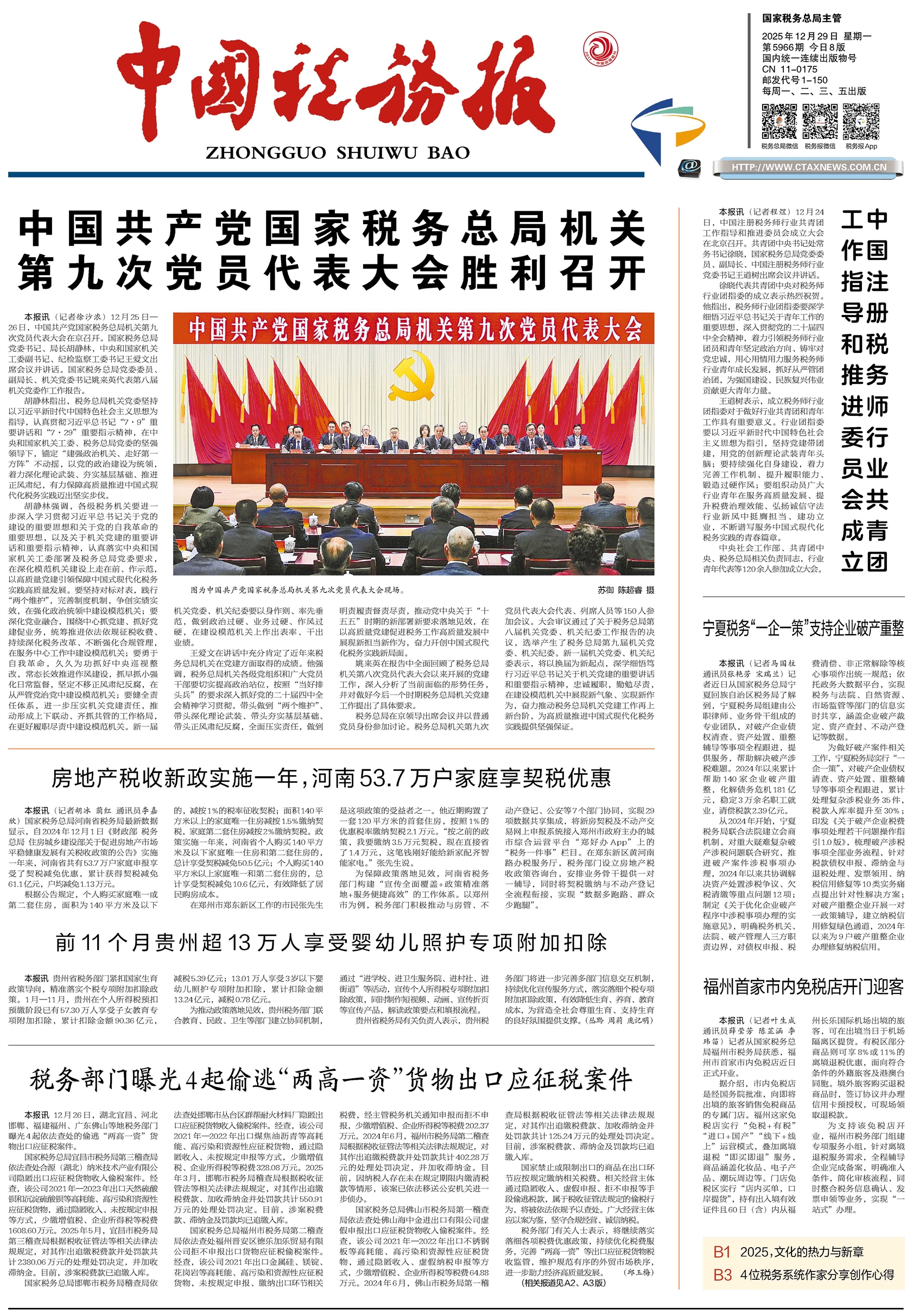 本报讯(记者徐沙浓)12月25日—26日,中国共产党国家税务总局机关第九次党员代表大会在京召开。国家税务总局党委书记、局长胡静林,中央和国家机关工委副书记、纪检监察工委书记王爱文出席会议并讲话。国家税务总局党委委员、副局长