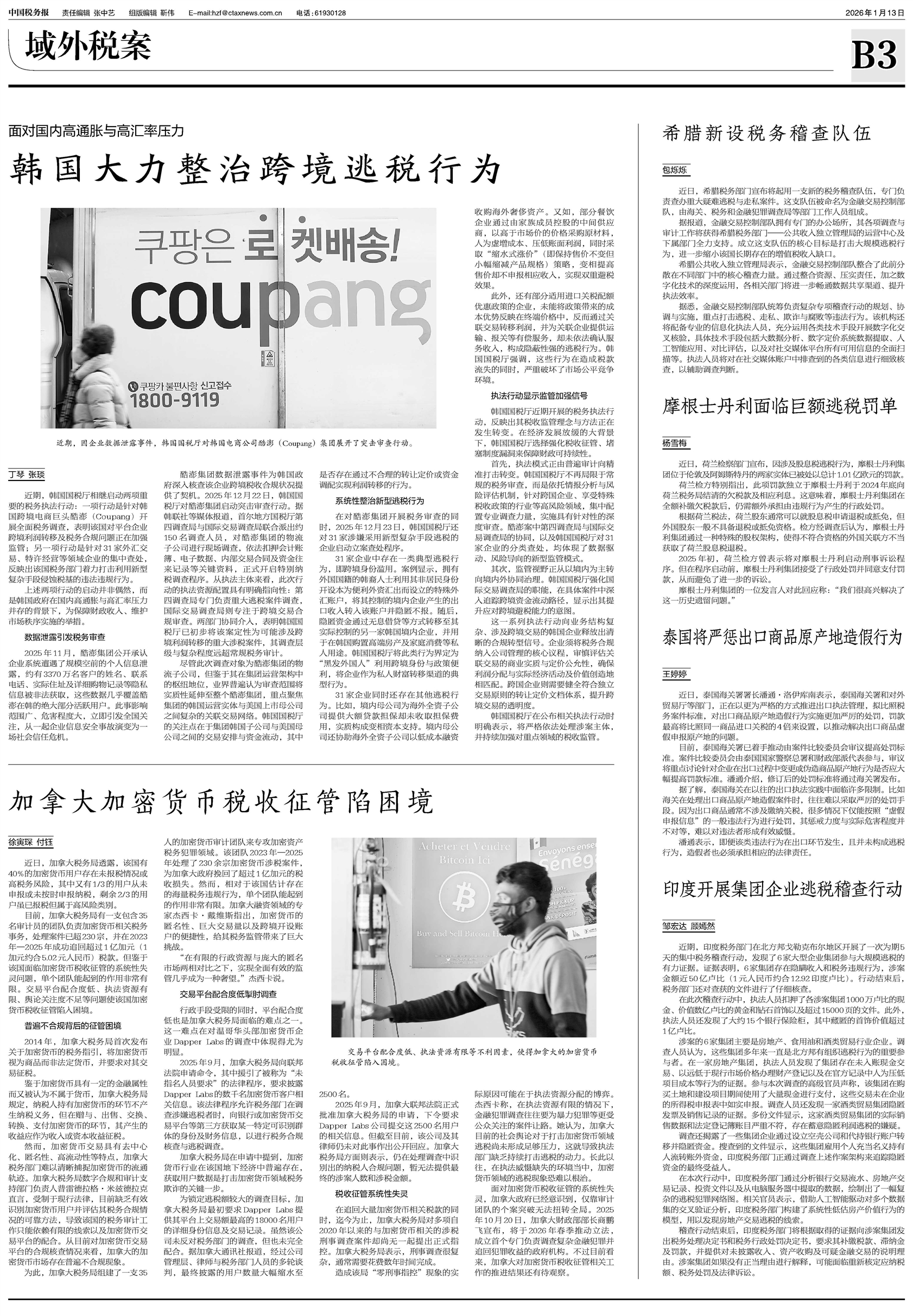近期,韩国国税厅相继启动两项重要的税务执法行动:一项行动是针对韩国跨境电商巨头酷澎(Coupang)开展全面税务调查,表明该国对平台企业跨境利润转移及税务合规问题正在加强监管;另一项行动是针对31家外汇交易、特许经营等领域