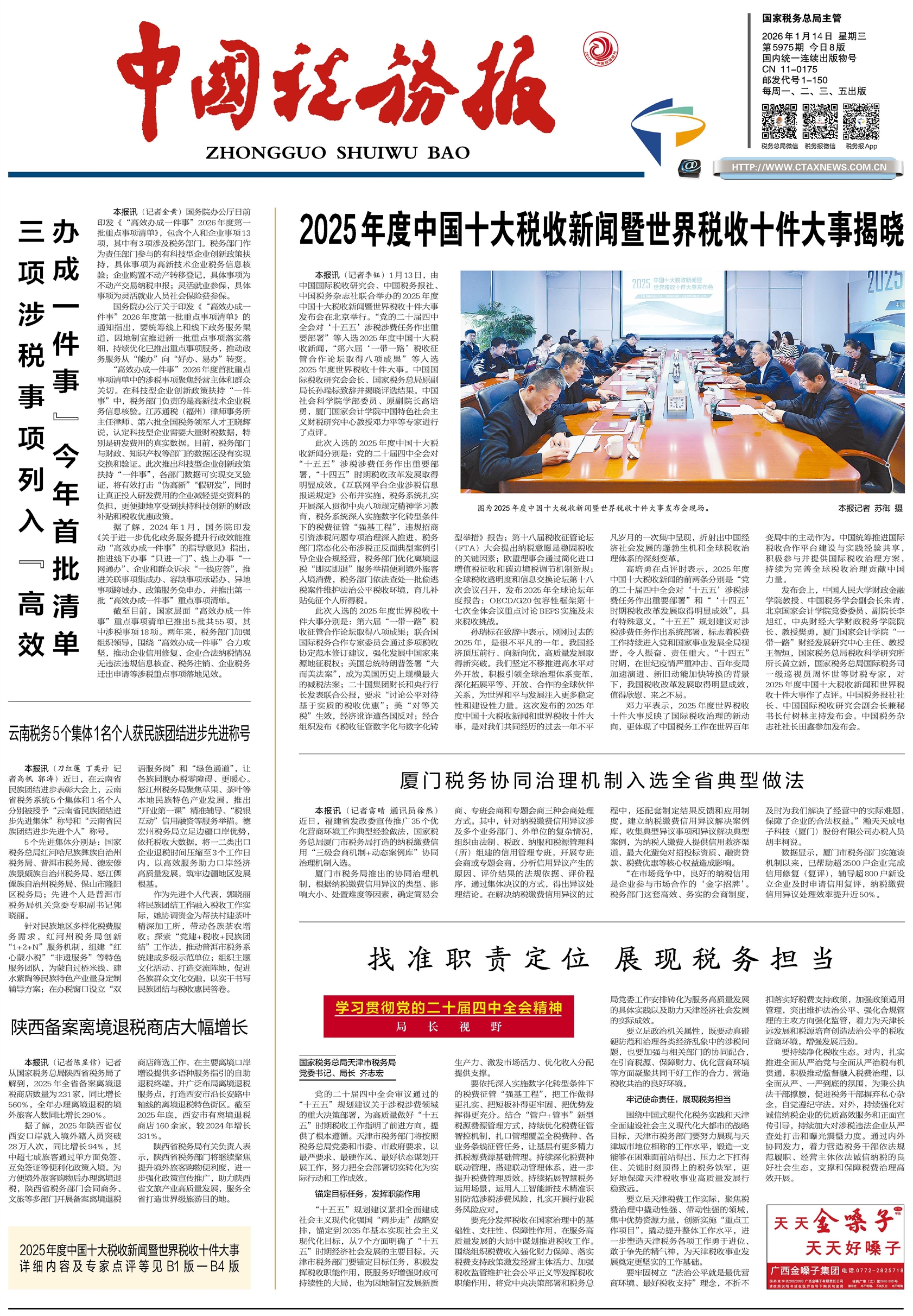 本报讯(记者李钰)1月13日,由中国国际税收研究会、中国税务报社、中国税务杂志社联合举办的2025年度中国十大税收新闻暨世界税收十件大事发布会在北京举行。“党的二十届四中全会对‘十五五’涉税涉费任务作出重要部署”等入选20