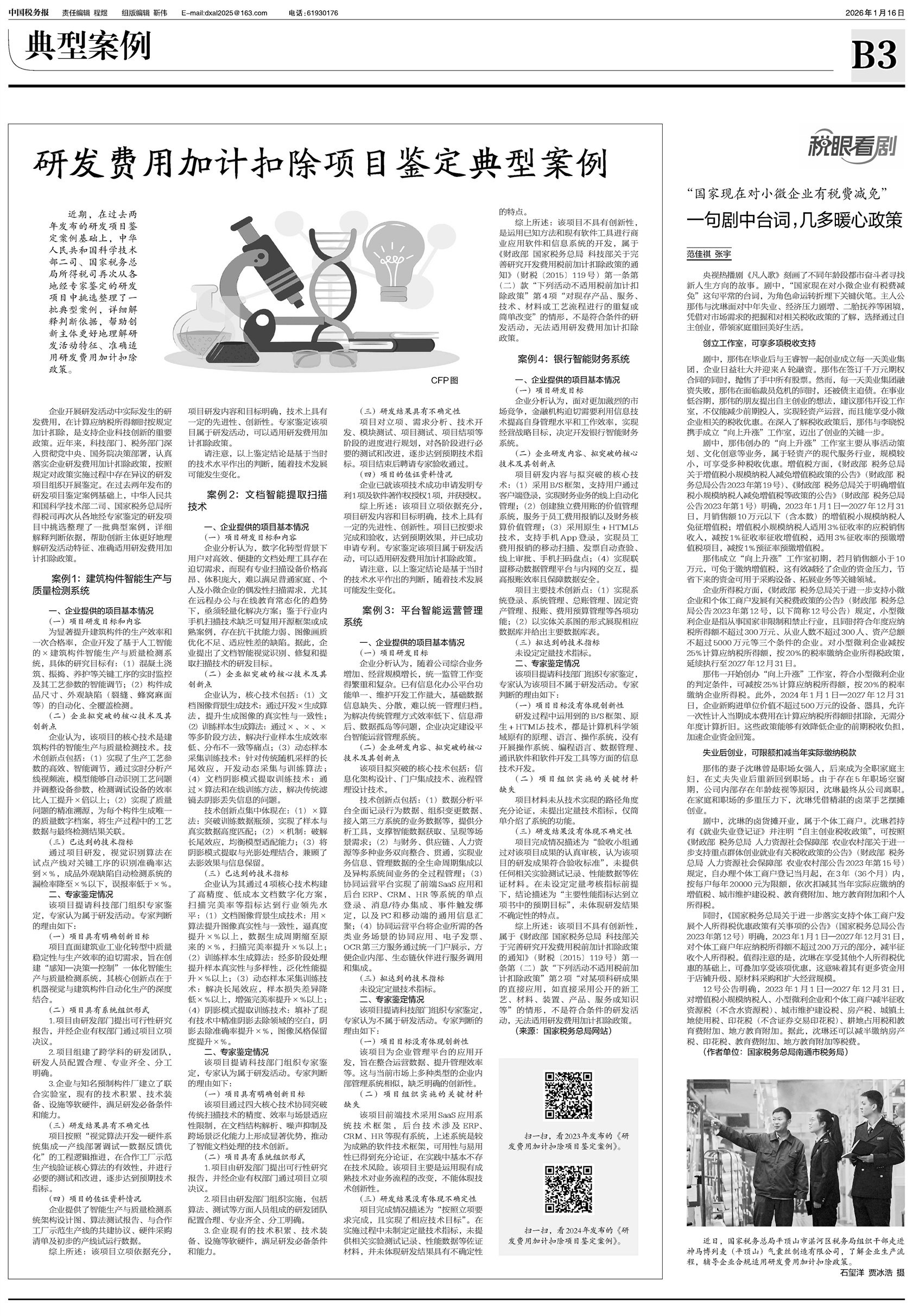近期,在过去两年发布的研发项目鉴定案例基础上,中华人民共和国科学技术部二司、国家税务总局所得税司再次从各地经专家鉴定的研发项目中挑选整理了一批典型案例,详细解释判断依据,帮助创新主体更好地理解研发活动特征、准确适用研发费用